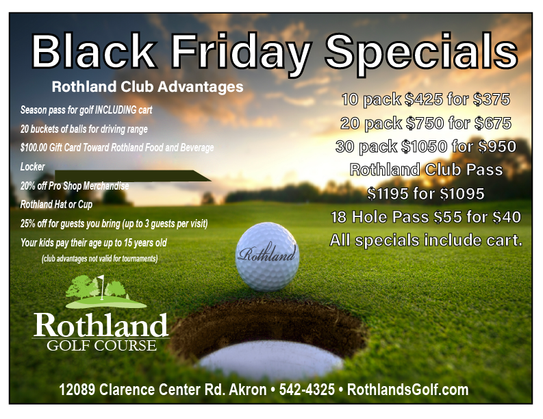 Our annual Black Friday sale begins this Friday, November 28 and runs through Monday, December 1. Please call the Pro Shop to purchase. (716) 542-4325